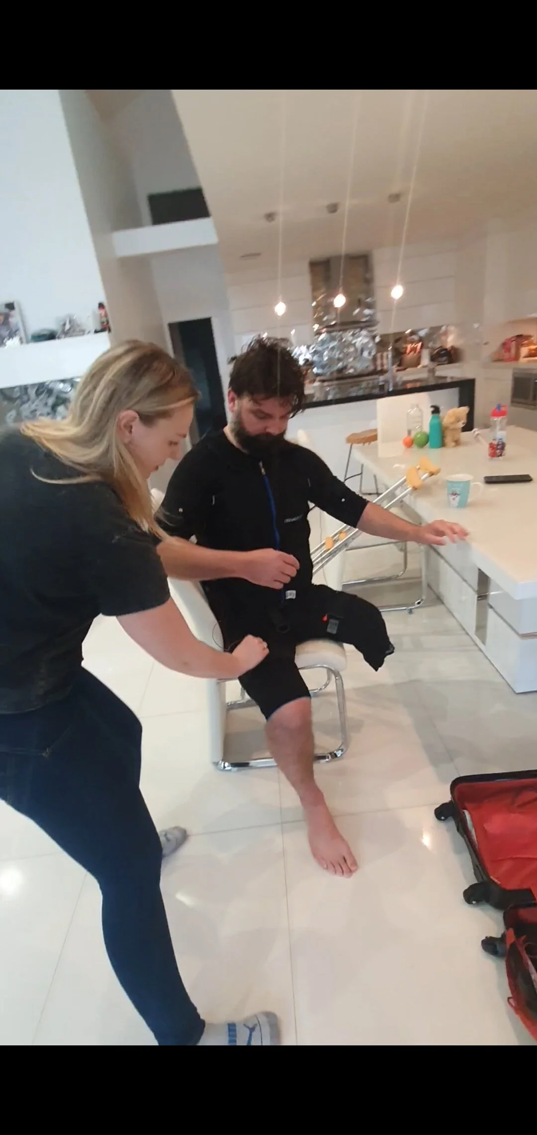 "Here is a clip of Dave using EMS for the first time on his full height legs. This is so much harder than training on shorter “stubbies” as the effort just to maintain balance is intense, let alone working with resistance bands and the fact the ems machine is making over 90% of his muscles contract!